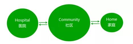 注:三個圓形分別代表醫院(H)、社區(衛生服務機構)(C)及家庭(H),三個圓形的面積大小是不一樣的,面積的大小分別代表其在營養管理中的作用大小。面積越大,作用越大。按照不同單位在營養管理中的作用,依次排列為社區衛生服務機構>醫院>家庭。