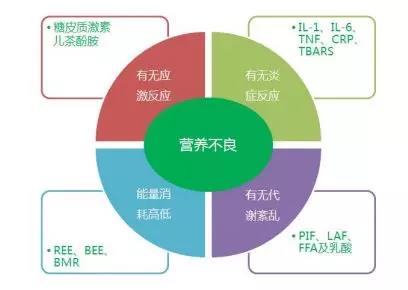 注:IL-1,interleukin1,白細胞介素1;IL-6,interleukin 6,白細胞介素6;TNF,tumor necrosis factor,腫瘤壞死因子;CRP,C reactive protein,C反應蛋白;TBARS,thiobarbituric acid reactive substances,硫代巴比妥酸反應產物;REE,resting energy expenditure,靜息能量消耗;BEE,basal energy expenditure,基礎能量消耗;MBR,basal metabolic rate,基礎代謝率;PIF,proteolysisinducing factor,蛋白水解誘導因子;LAF,lipid mobilizing factor,脂肪動員因子;FFA,free fatty acids,游離脂肪酸。
