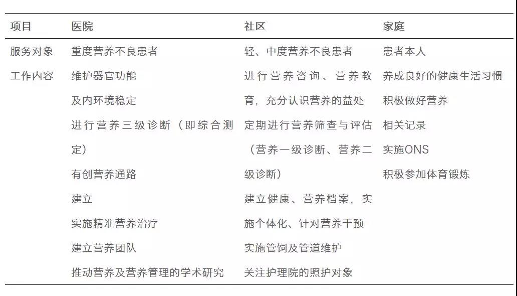 醫院、社區(衛生服務機構)、家庭在整個營養管理系統中既相互聯系、但又相互區別,表1總結了不同單位的角色定位、服務對象、工作內容。HCH模式不僅僅適用于營養管理,同樣適用于各種慢性病管理。
