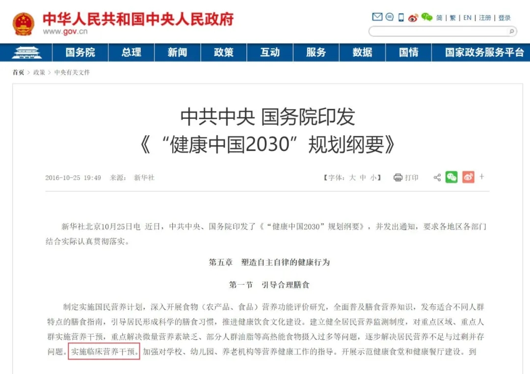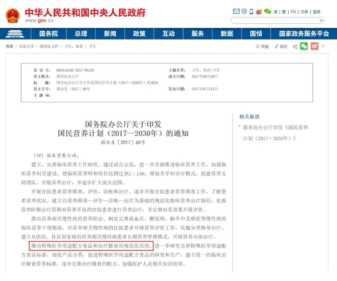 2017年,國務院印發并實施《國民營養計劃(2017-2030年)》,強調:“推動特殊醫學用途配方食品和治療膳食的規范化應用”。