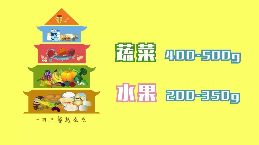 再看第二層的蔬菜和水果,蔬菜每天要攝入400-500g,而水果則是200-350g。