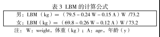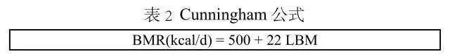 1980 年 Cunningham JJ 利用 Harris JA 及 Benedict FG 的 239 例受試者的原始數據,排除 16 例運動員的數據后,回歸分析發現 LBM 是基礎代謝率(basal metabolic rate,BMR)的唯一顯著有效預測因素,年齡、性別、身高及體重均是 LBM 的影響因素,與 BMR 無明顯直接關系。因此,得出基于 LBM 的公式如表 2。