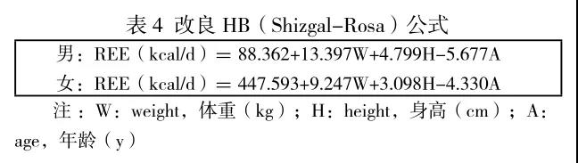 鑒于 HBE 的缺陷,1984 年 Roza AM 及 Shizgal HM 用 Harris JA 及 Benedict FG 當年的原始數據結合新的數據,對原始 HBE 進行了重新評價與修訂,改良后的 HBE 如表 4,又稱為 Shizgal-Rosa 公式。研究發現,該公式與實際能量消耗更加接近,更加準確。在 1990 年 The Mifflin-St Jeor 公式出現之前,Shizgal-Rosa 方程式是最為準確的 REE 預估公式。