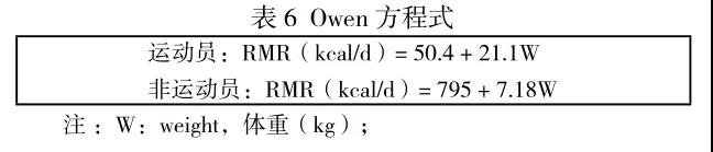 1986 年 Owen OE 等用間接測熱法測量了 44 例 18~65 歲,體重 43~143 kg 健康女性的能量消耗,其中有 8 位運動員。多因素回歸分析發現,只有體重與 RMR 關系最為密切,而且運動員與非運動員有顯著差別。由此,他們建立了 Owen 方程式,見表 6。