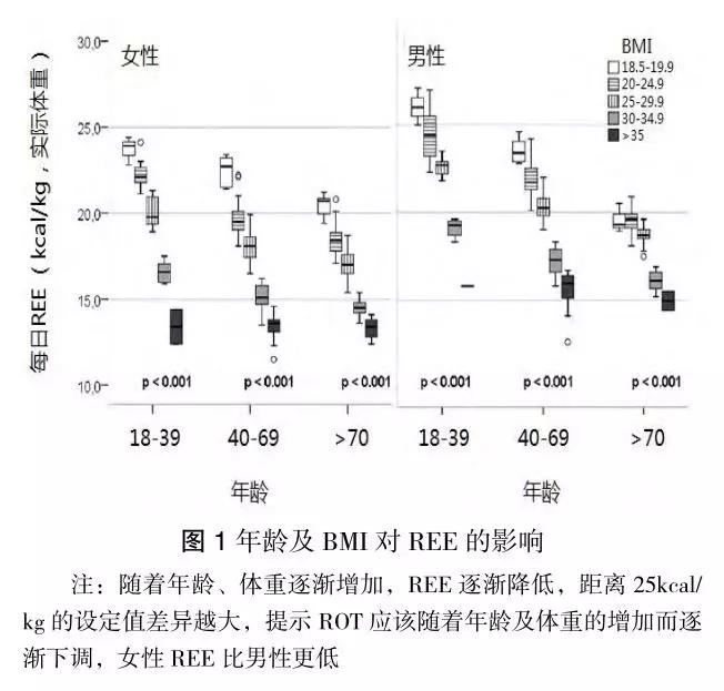 隨著體重增加,ROT 值應該下調,因為增加的體重是脂肪組織,而脂肪組織是非活躍器官。Zauner A 等建議對體重正常、超重、肥胖、病態(嚴重)肥胖患者分別使用 25kcal/kg、22kcal/kg、20kcal/kg、16kcal/kg 計算其 REE。同樣,隨著年齡的增加,成年后每 10 年 REE 下降 1%~2%,ROT 也應該下調,因為肌肉逐漸減少,而脂肪組織的比例相對升高。