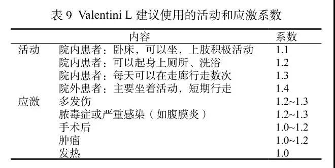 Valentini L等對 5 家醫院 676 例連續入院患者用 HBE 計算其 REE,發現即使采用理想體重計算,ROT 的 25kcal/kg 也高估了 95% 患者的能量需求,而且隨著年齡增加、隨著體重增加,其高估值越大,而且還有顯著的性別差異,圖 1。有鑒于此,ESPEN 2009 指南推薦 25kcal/kg 是患者的 TDEE,而不是 REE,只有在極少數嚴重應激狀態下,才需要 30kcal/kg 。Valentini L 等還建議,創傷、疾病等應激條件下計算 TDEE 時,根據年齡、性別及體重調整后的 REE 應該乘以應激系數,但是主張降低傳統的應激系數數值,將系數根據應激輕、中、重分為 1.1、1.2 及 1.3 三個等級,見表 9。