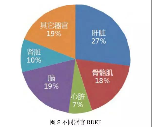 根據代謝率不同,人體組成可以分為8個部分,即腦、心、肝、腎、骨骼肌、骨骼、脂肪組織及其他組織,其能量需求(消耗)各不相同,骨骼為 2.3kcal/(kg?d),骨骼肌為 14.5kcal/(kg?d),脂肪組織為 13kcal/(kg?d),腎臟、心臟為 440kcal/(kg?d),腦 240kcal/(kg?d),肝臟 200kcal/(kg?d)。腦、肝、心、腎盡管占全部體重不足 6%,但是其總能量消耗占 REE 的 60%~70%,骨骼肌盡管占全部體重的 40%~50%,但是其能量消耗只占 REE 的 20%~30% 。不同器官組織的耗能比例見圖 2。