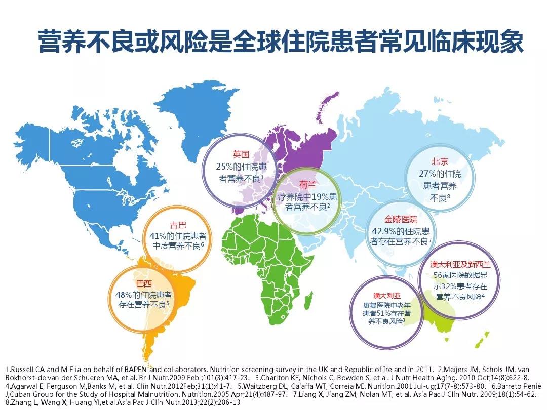 營養(yǎng)不良或營養(yǎng)風(fēng)險(xiǎn)是全球住院患者常見的臨床現(xiàn)象(如下圖)。